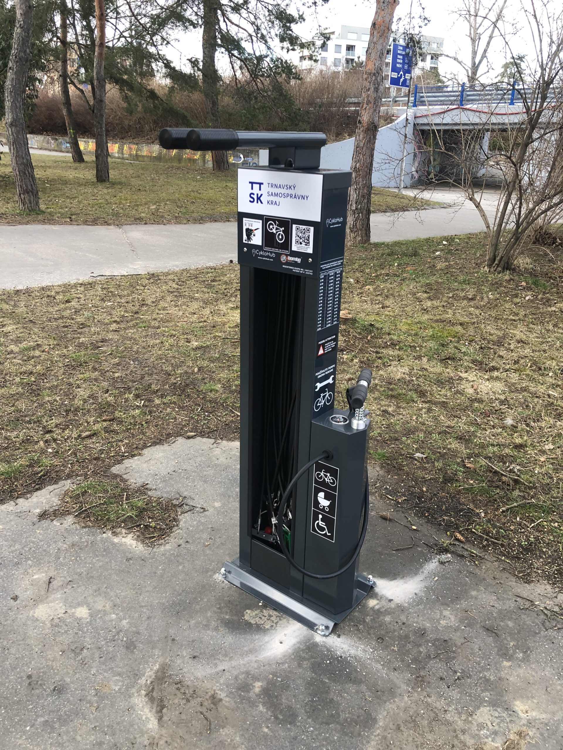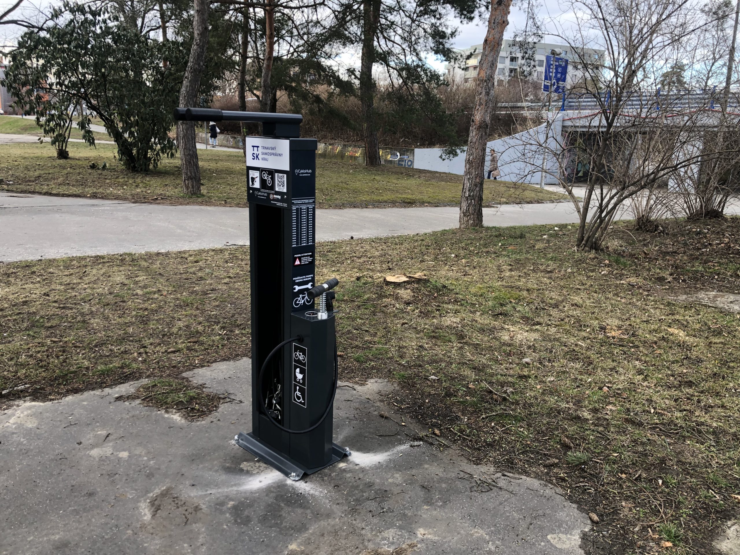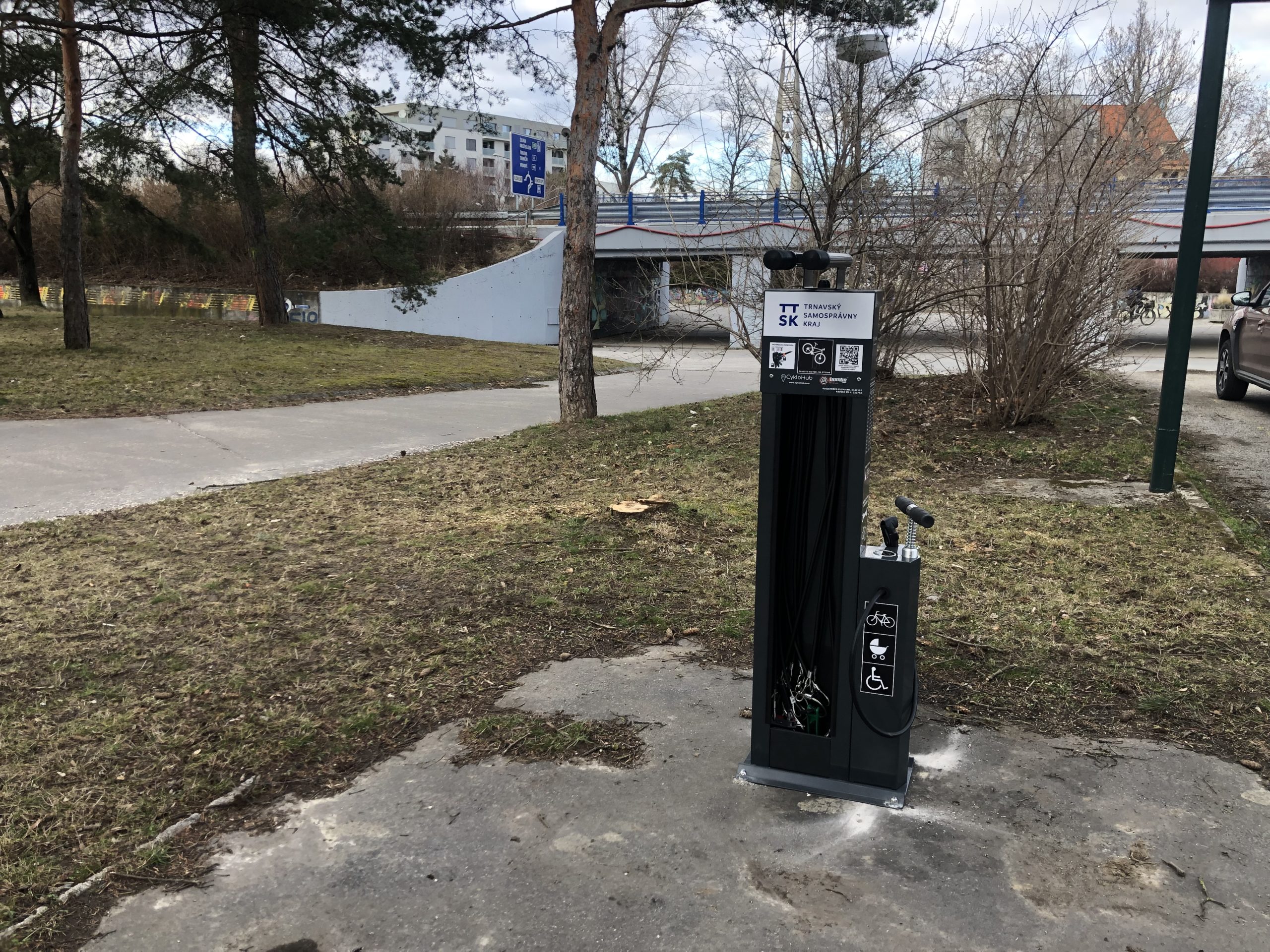 Slovenský cykloklub vďaka spolupráci s Trnavským samosprávnym krajom osadil v meste Piešťany nový cykloservisný stojan. Ten sa nachádza pri „kruhovke“ pri basketbalovom ihrisku. Pri výbere lokality napomáhal aj Mestský úrad Piešťany. Umiestnenie križuje veľmi frekventovaný cyklokoridor.